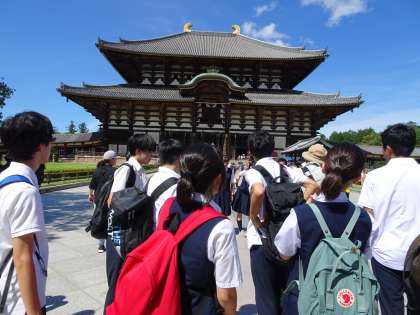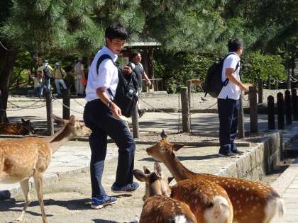 東大寺を見学しています。大仏殿の見学を終えて鹿に鹿せんべいをあげています。(遠藤)