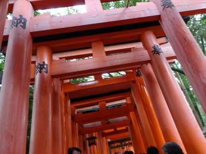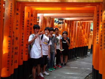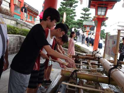 伏見稲荷大社です。手水で手を清めてから境内を見学します。千本鳥居で記念撮影をしています。(遠藤)
