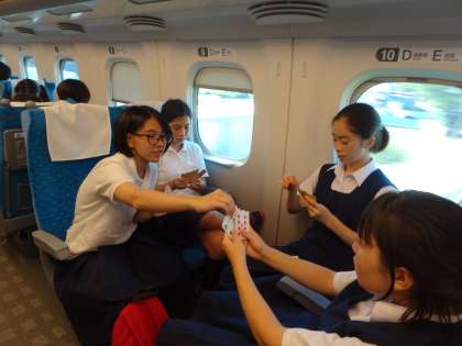 帰り新幹線の車内の様子です。みんなでトランプをして楽しんだり、軽食を食べたりしています。生徒たちはまだまだ元気です。品川駅到着予定は16:49です。(遠藤)