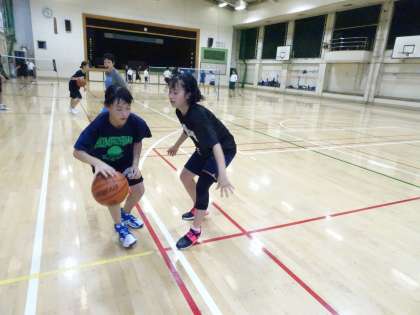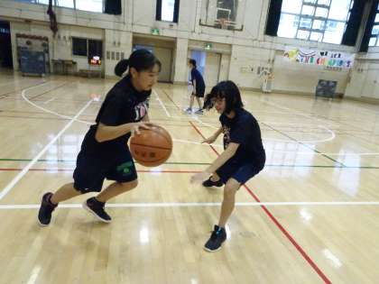 体育館では女子バスケットボール部が活動しています。1対1をやっています。バックチェンジやレッグスルー等を使って相手を抜いていきましょう。(遠藤)