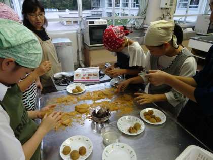 今日の家庭科部は「うぐいすもち」を作っています。きれいにできあがりましたね。(遠藤)
