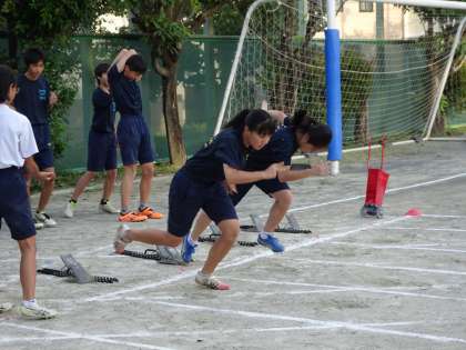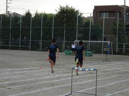 校庭では陸上競技部が活動しています。50mのタイムを計測していました。(遠藤)