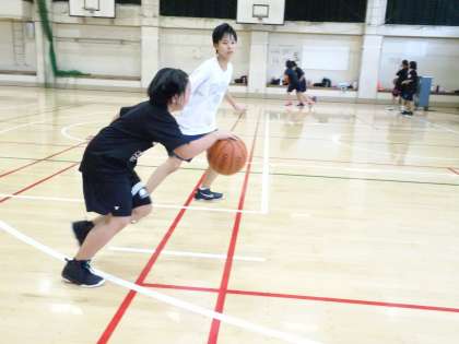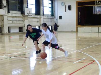 15時から女子バスケットボール部が体育館で活動しています。1対1のディフェンスの付き方の練習をしていました。(遠藤)