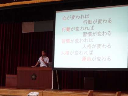 さて、2学期も1学期に引き続きいろいろな行事があります。そんな中、3年生。やっぱり進路決定に向けた取組や学習で頭がいっぱいのことでしょう。何かをやり遂げるということは、とても大変なことですよね。そんな3年生を含め、皆さんに一つの話、言葉を紹介します。特に多くの解説はしません。皆さんがこの言葉を聞いて、どう感じるか。どう思うか。何かの機会に聞いてみたいと思いますが。それでは紹介します。