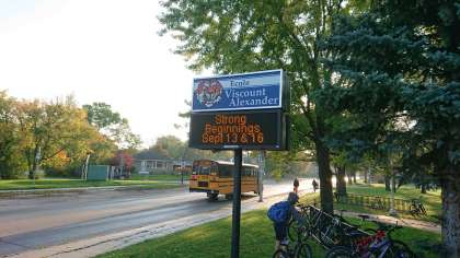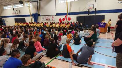 本日はお世話になる3校で歓迎集会が開催されました。最初に訪れた学校は、ヴァイカウント・アレキサンダー校です。朝の校内放送はフランス語で行われていました。公用語が英語とフランス語であることが実感できました。(桝田)