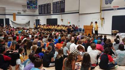 最後の訪問校は、チャールズウッド校です。どの学校でも全校生徒が集まり、大歓迎を受けました。生徒はその後、授業に入りました。(桝田)