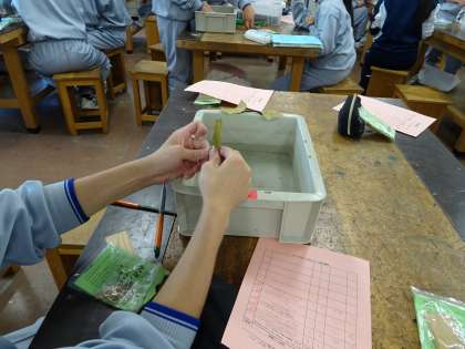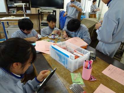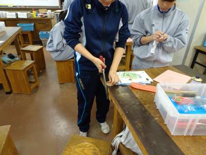 3年A組の技術の授業です。キーホルダーを作成しています。やすりできれいに磨いています。(遠藤)