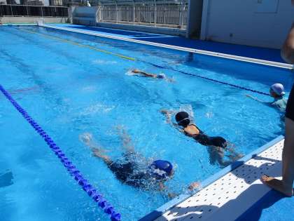 1年A組の体育の授業です。男子は格技室でマット運動をしています。女子は水泳です。リレーをしていました。(遠藤)