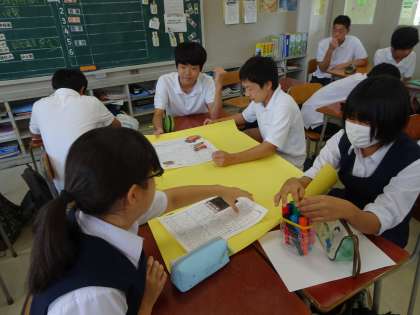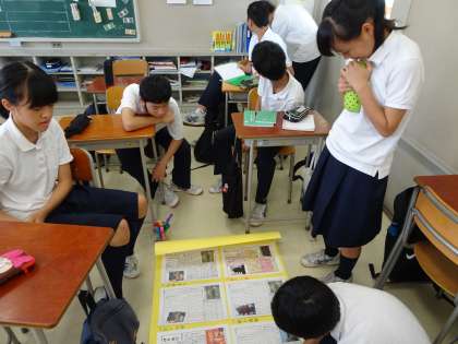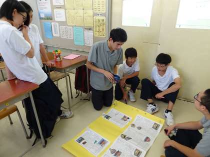 事後学習の新聞が今日で完成です。各班ごとにレイアウトを考えながらまとめています。若竹祭の作品展で展示することになっています。(遠藤)