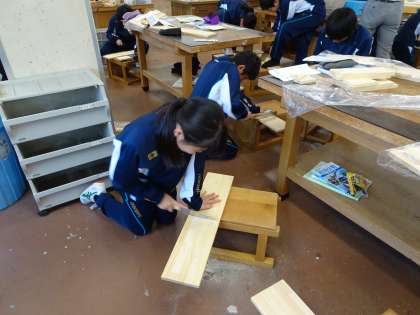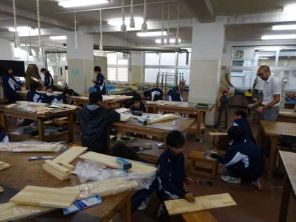 1年A組の技術の授業の様子です。本棚を作っています。のこぎりを正しく使って板をまっすっぐ切りましょう。(遠藤)