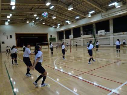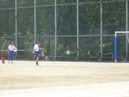 3年AB組の体育の様子です。男子は校庭でサッカーです。シュートのテストをしています。女子は体育館でバレーボールをしていました。(遠藤)