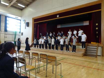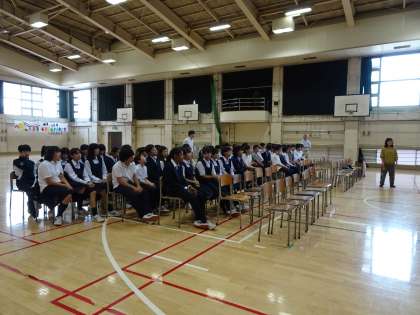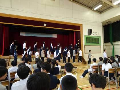 1年生が合唱コンクールの学年練習を行っています。鑑賞座席の確認をしてから、入退場の練習をしていました。(遠藤)