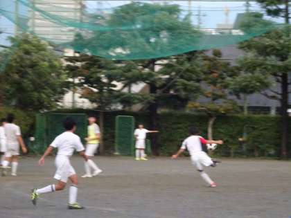 サッカー部が校庭で活動しています。コーナーキックの練習をしていました。(遠藤)