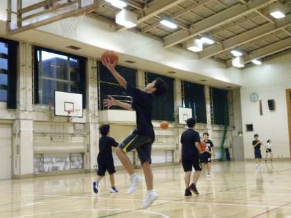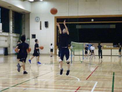 体育館では男子バスケットボール部が活動しています。シュート練習をしています。自分のマークマンとの距離を見て、シュートを打つのかドライブするのか瞬時に判断しましょう。(遠藤)