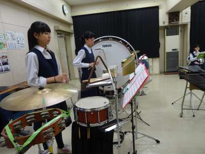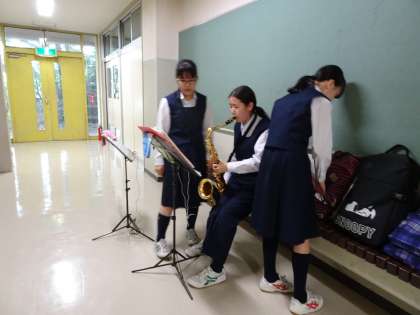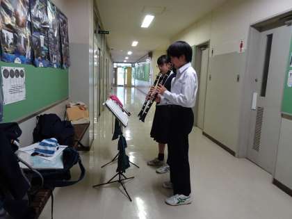 吹奏楽部が活動中です。若竹祭の午後の部に向けてパート毎に練習をしています。(遠藤)