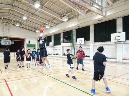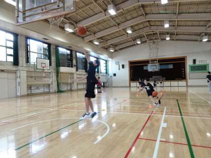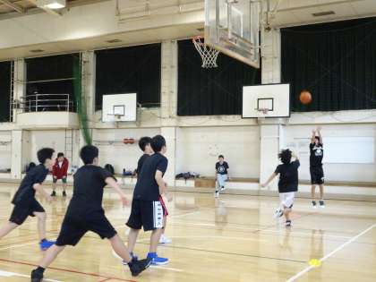 体育館では男子バスケットボール部が活動しています。サークルドリブルや3対3、リバウンドの練習をしています。(遠藤)