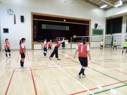 3年AB組の体育の授業です。女子は体育館でバレーボールです。ALTの先生もいっしょに参加しています。(遠藤)
