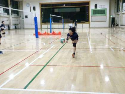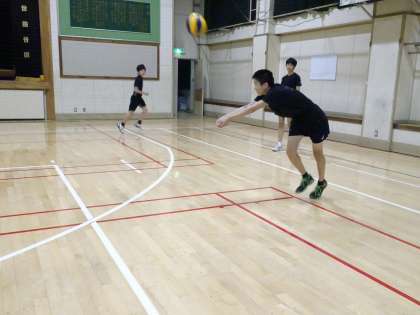 バレーボール部が体育館で活動しています。レシーブ練習をしています。まず、ボールの落下点にすばやく入りましょう。(遠藤)