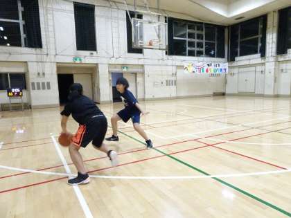女子バスケットボール部が体育館で活動しています。1対1をやっています。(遠藤)