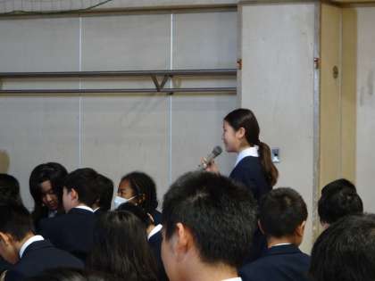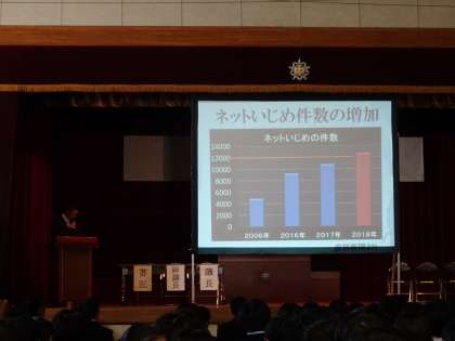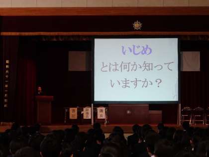 生徒総会の後、いじめ防止集会を行いました。生徒会本部役員がスライドを使って「いじめの定義」や「ネット上でのいじめの具体例」をクイズを交えて説明しました。(遠藤)