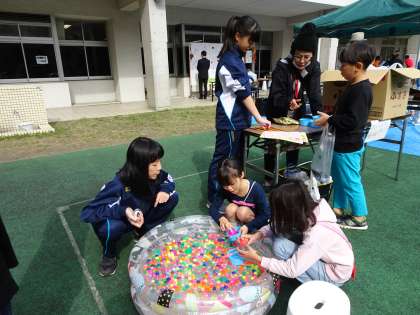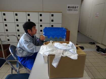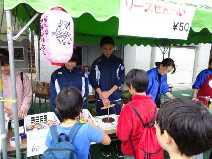スーパーボールすくいやソースせんべいの販売、受付でスリッパを渡すお手伝いをしています。(遠藤)