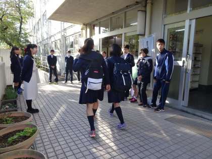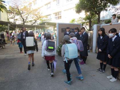 駒の学び舎あいさつ運動2日目です。今日は三軒茶屋小にあいさつ運動にきています。(遠藤)