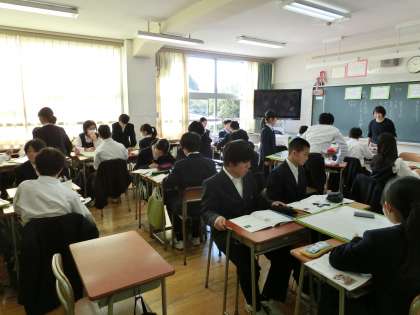 1年生は「多文化の理解」をテーマに『違いを乗り越えて』という資料で、2年生は「規則の役割」をテーマに『美しい鳥取砂丘』という資料で、3年生は「公共の場での心構え」をテーマに『自分・相手・周りの人』という資料で授業を行いました。どのクラスも集中して担任の先生のお話を聞き、話し合い活動ではそれぞれ自分の意見を言い合い、充実した活動となっていました。(遠藤)