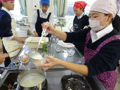 家庭科部が活動中です。今日は牛乳寒天を作っています。冷やして固めてきれいにできあがりました。(遠藤)