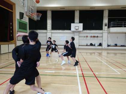 男子バスケットボール部が体育館で活動しています。パスやドリブル、スクリーンアウトの練習をしています。(遠藤)
