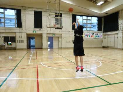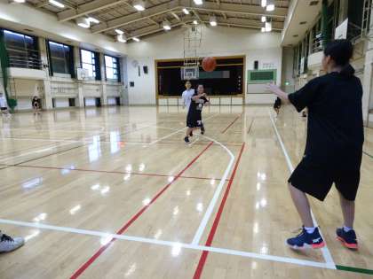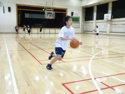 午後の体育館では女子バスケットボール部が活動中です。ドリブルチェンジやスクエアパス、シュート練習をしています。(遠藤)