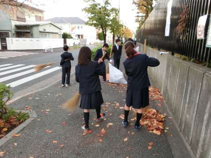 雨が上がり、落ち葉掃きを行うことができました。今日は1年生の担当です。学校前の歩道がとてもきれいになりました。(遠藤)