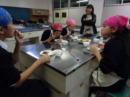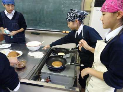 今日の家庭科部はパンケーキを作っています。甘くて美味しそうな匂いが漂っています。(遠藤)