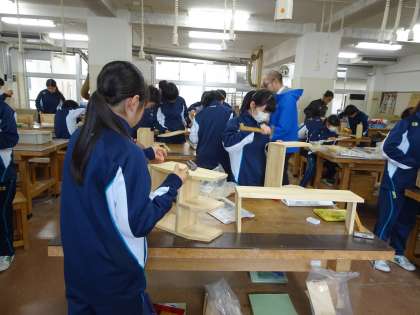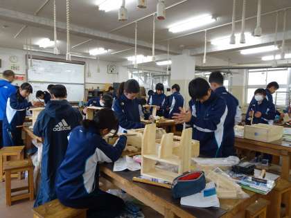 1年A組の技術の授業です。本棚の組み立てに入っています。(遠藤)