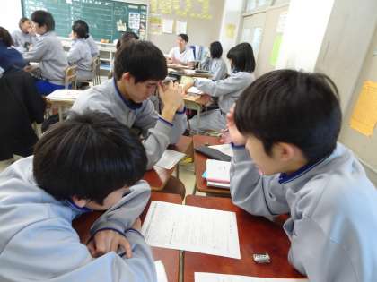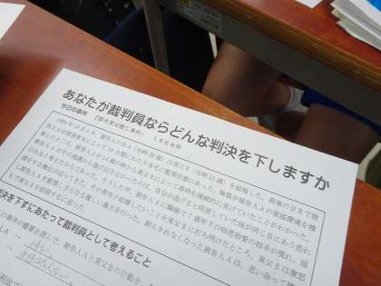 3年D組の社会の授業です。実際の事件をもとに、あなたが裁判員ならどんな判決を下すか、グループで話し合いをしています。(遠藤)