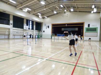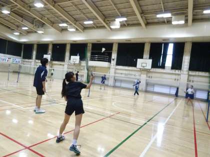 14時半からバドミントン部が体育館で活動しています。基礎打ちです。クリアの練習をしています。(遠藤)