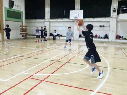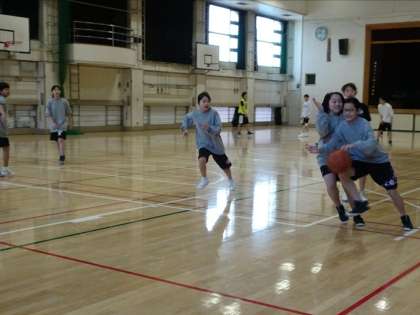 体育館ではバスケットボール部が活動しています。男子は三角パス、女子は3対3をやっています。(遠藤)