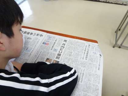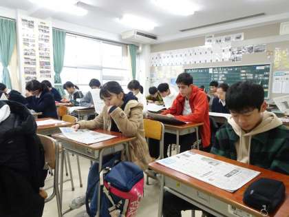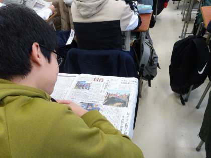 土曜授業の朝はNIEタイムです。今日は毎日新聞を読んでいます。また、カジュアルデーなので私服で登校しています。(遠藤)