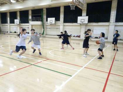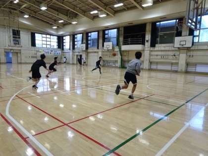 体育館ではバスケットボール部が活動しています。男子はマイボールにしてから速く攻める練習をしています。女子はエンドラインからのスローインの練習です。(遠藤)