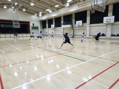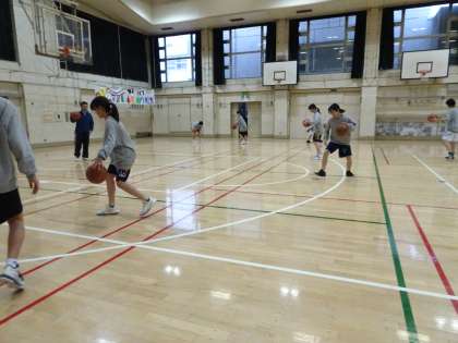15時から女子バスケットボール部が体育館で活動しています。フットワークやドリブル練習をしています。(遠藤)