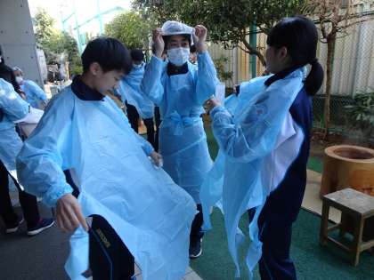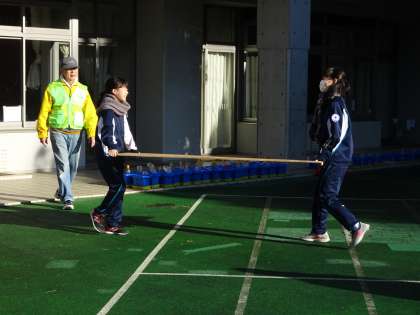 JRC部が新春子どももちつき大会に参加しています。荷物を運んだり、エプロンをつけてもちつきの準備をしたりしています。(遠藤)