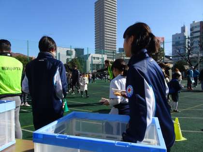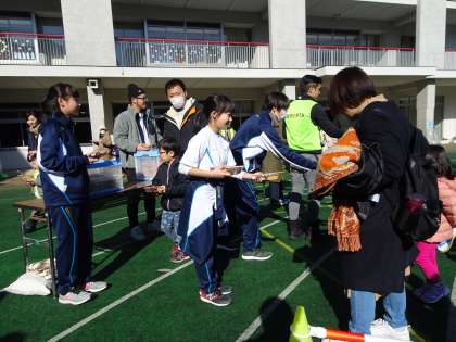 お餅の配布が始まりました。JRC部の1年生がお手伝いをしています。(遠藤)