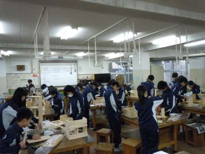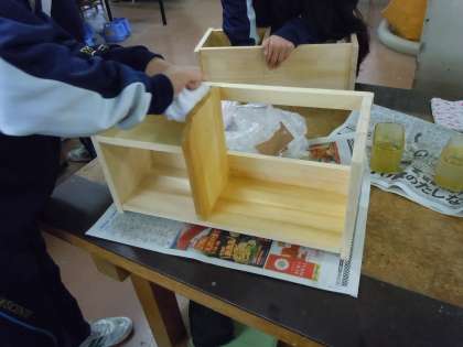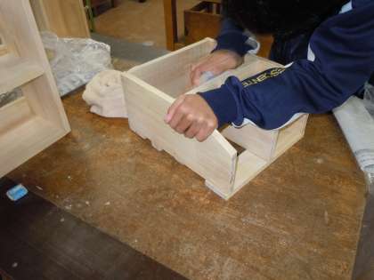 木材加工の塗装工程です。やすりをかけて、塗装を施します。塗料は米ぬかオイルからできているので安心して使用できます。ていねいな作業ですね。(桝田)