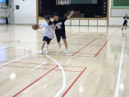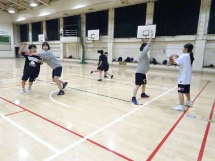 体育館では女子バスケットボール部が活動しています。ドリブル練習やエンドラインからのスローインの練習をしています。(遠藤)