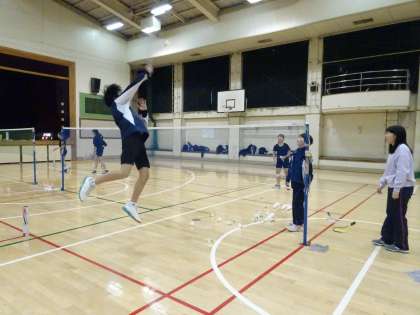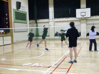 午後の体育館ではバドミントン部が活動しています。プッシュの練習をしています。フォアとバックの両方ともきちんと身につけましょう。(遠藤)