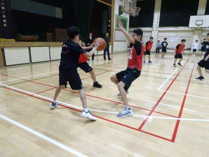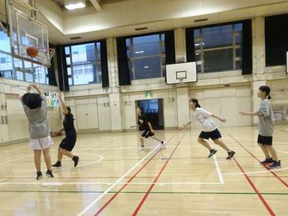 体育館ではバスケットボール部が活動しています。男子は5対5でディフェンスの練習をしています。女子は3対2でアウトナンバーで守る練習をしていました。(遠藤)
