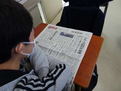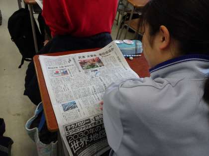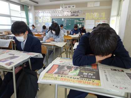 土曜授業の朝はNIEタイムです。今日は読売新聞を読んでいます。新型肺炎についての記事を読んでいる生徒が多いですね。(遠藤)
