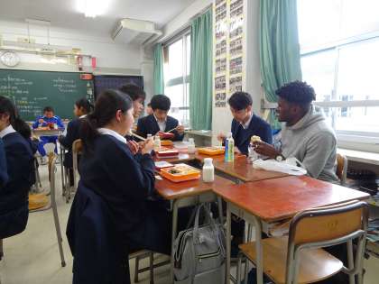 給食の時間の様子です。ALTのジェローム先生が3年D組の教室でいっしょに給食を食べています。(遠藤)