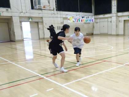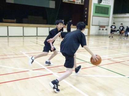 体育館ではバスケットボール部が活動しています。男子は0度や45度からの1対1の練習です。女子はドリブル練習をしています。(遠藤)