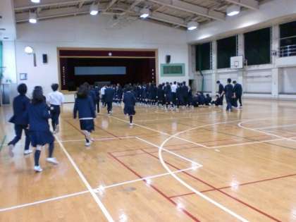 本日1校時、避難訓練を実施しました。近隣の火災想定で、雨天のため避難先を体育館としました。講評では、おしゃべりがほとんどなかった点がほめられました。引き続き、今日から始まった「交通安全旬間」にちなみ、自転車使用時の安全についての話がありました。
