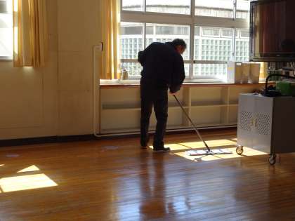 3年生の教室にソシオさんがワックスをかけてくれています。最後の1日をピカピカの教室で過ごすことができますね。(遠藤)